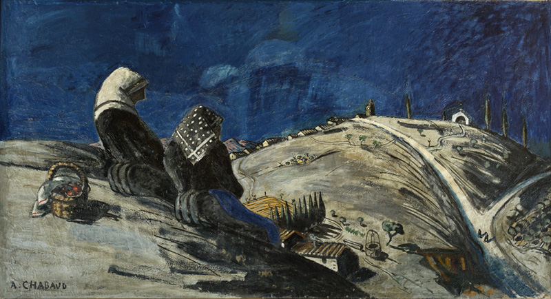 Les Provençales en méditation sur la colline d'Auguste Chabaud sont empreintes d'une dimension mystique. Ces deux silhouettes de paysannes de dos, portant un fichu sur la tête, sont chargées d'une intensité quasi-religieuse, qui se matérialise par une force toute graphique. Au sommet d'une colline, elles veillent sur une vallée agricole dépouillée. Dans ce paysage assez rude, deux silhouettes cheminent sur un sentier. Plus haut, une autre colline accueille une petite chapelle annoncée par des cyprès, tandis que de l'autre côté de ce promontoire, un village s'est établi, sur une pente certainement plus propice.