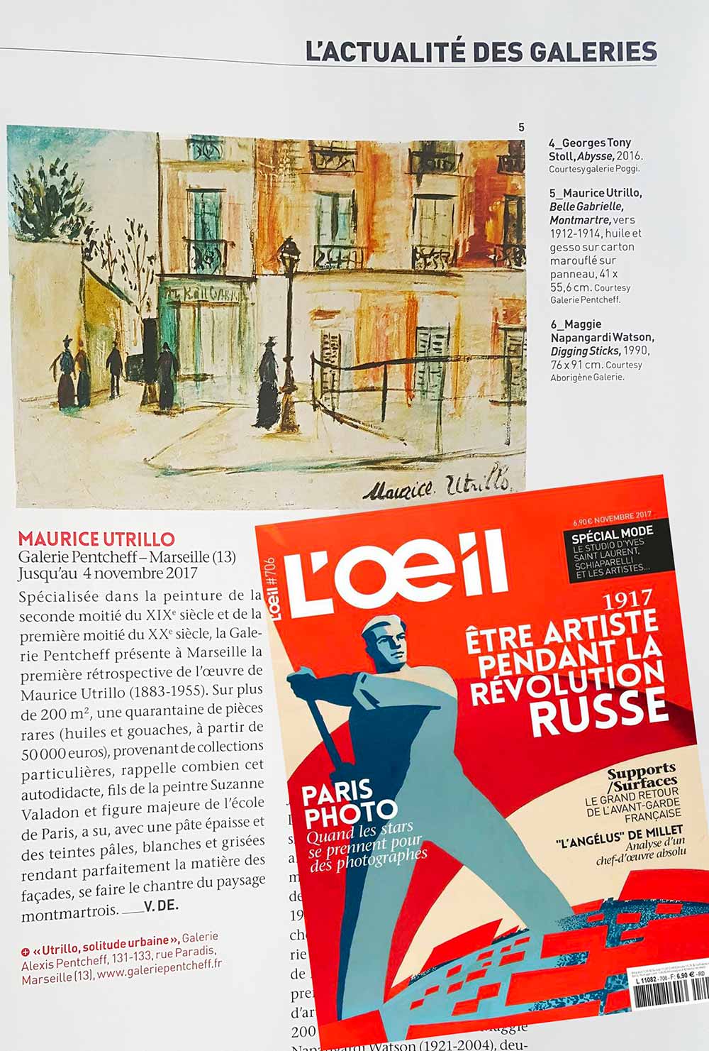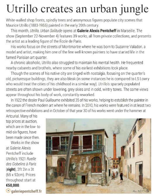 L'artiste a été le sujet d'importantes expositions à l'étranger, notamment au Japon, ainsi que d'un documentaire télévisé retraçant son destin tumultueux et celui de sa mère, Suzanne Valadon. À travers cette rétrospective, la galerie souhaitait remettre en lumière toute l'importance et la singularité de l'œuvre de Maurice Utrillo.