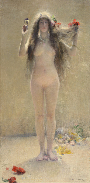 Sur un fond nu, une pale jeune femme se tient debout, nue elle aussi, sans autre atour que de longs cheveux dénoués qui lui retombent à la taille. L’une de ses mains levée s’y glisse, entremêle à la chevelure des fleurs rouges de pavot, tandis que de son autre main, elle tient ostensiblement une pensée colorée.