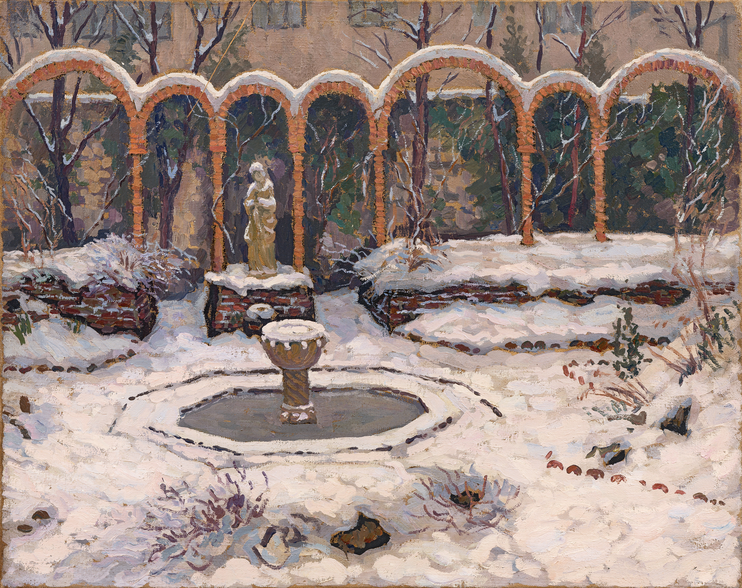 Neuilly, jardin sud sous la neige, bassin gelé et arceaux