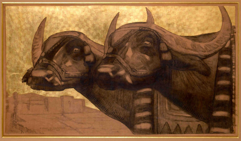 Le modèle de cette eau forte date de 1917, alors que Jouve est à Salonique dans l’Armée d’Orient et que parvenant à peindre et à dessiner, il prend pour modèle les buffles caractéristiques de cette région.