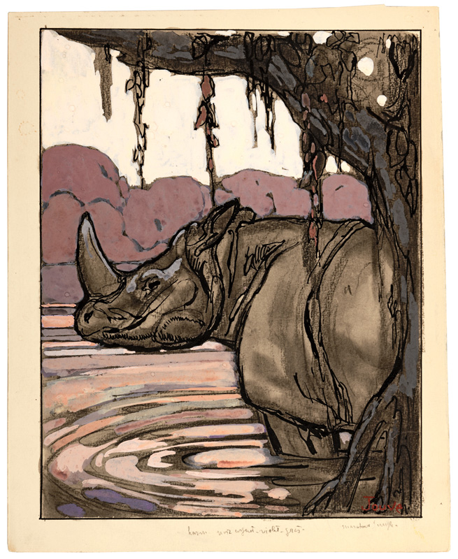 Encre de chine, crayon et gouache sur papier Japon, signé en bas à droite, annoté par l'artiste hors marge en bas "harm(onisé) noir argent violet gris - jungle"