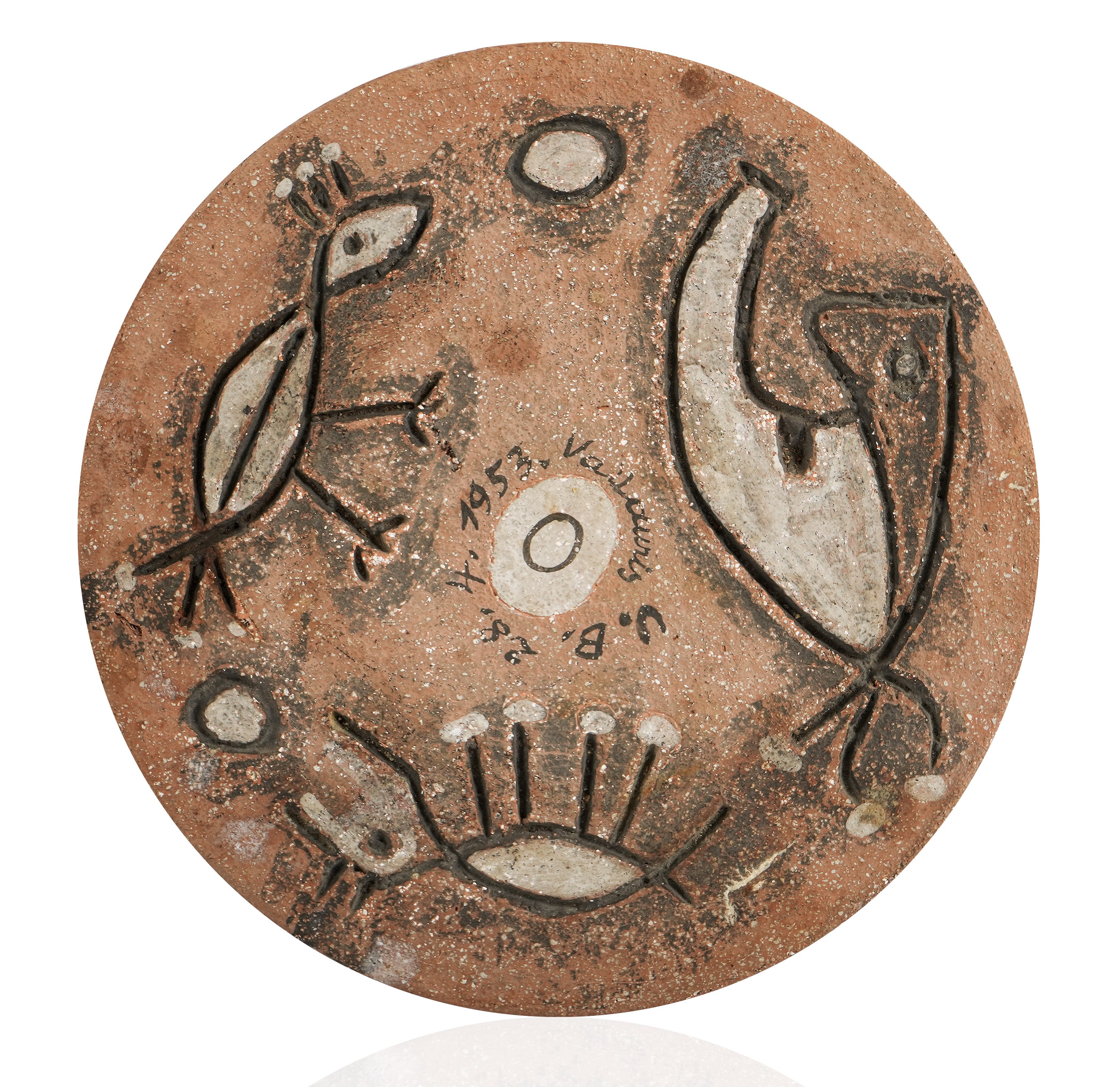 Terre cuite peinte et gravée, monogrammée, datée 28.4.1953 et située Vallauris au centre.